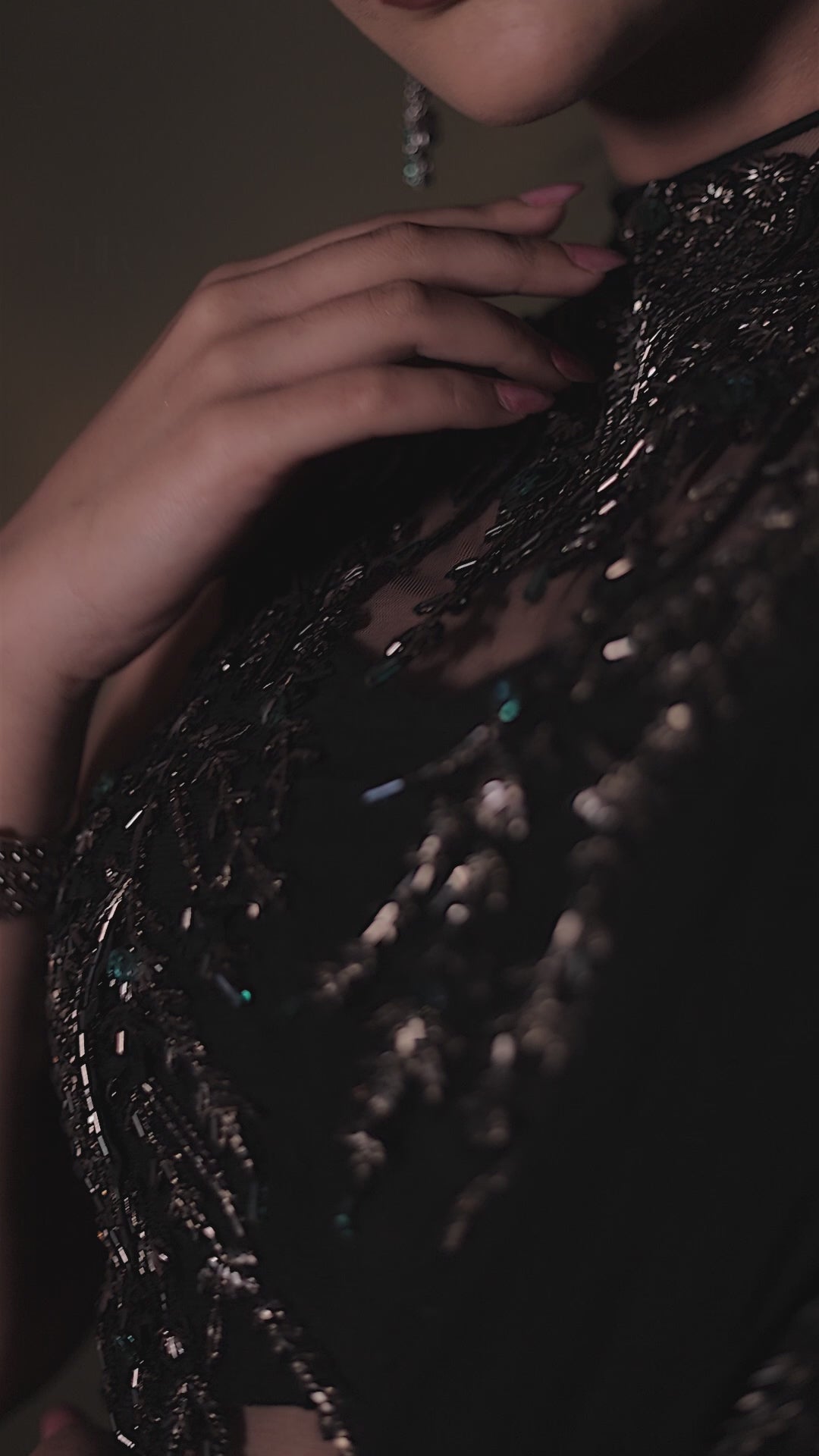 This refined saree gown blends the fluidity of a drape with the structure of a gown, crafted in a silhouette that flatters and flows. Adorned with intricate silver dabka, cutdana, sari threadwork, and bead embroidery, the ensemble shimmers with artisanal detail. The high-neck design adds a regal touch, balancing modesty with sophistication. A perfect choice for evening occasions where elegance meets edge.