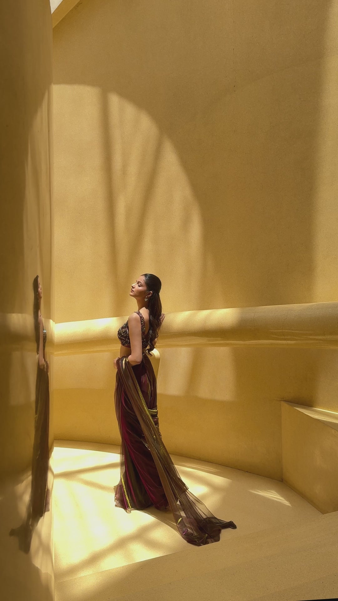 This radiant pre-draped saree is crafted in shimmer knit fabric, offering a sleek, sculpted silhouette that glimmers with every movement. Paired with a delicately hand-embroidered Chantilly lace blouse, the ensemble exudes refined elegance and couture craftsmanship. The contrast between the fluid shimmer and the intricate lace creates a look that’s both bold and romantic—perfect for evening occasions that demand effortless glamour.