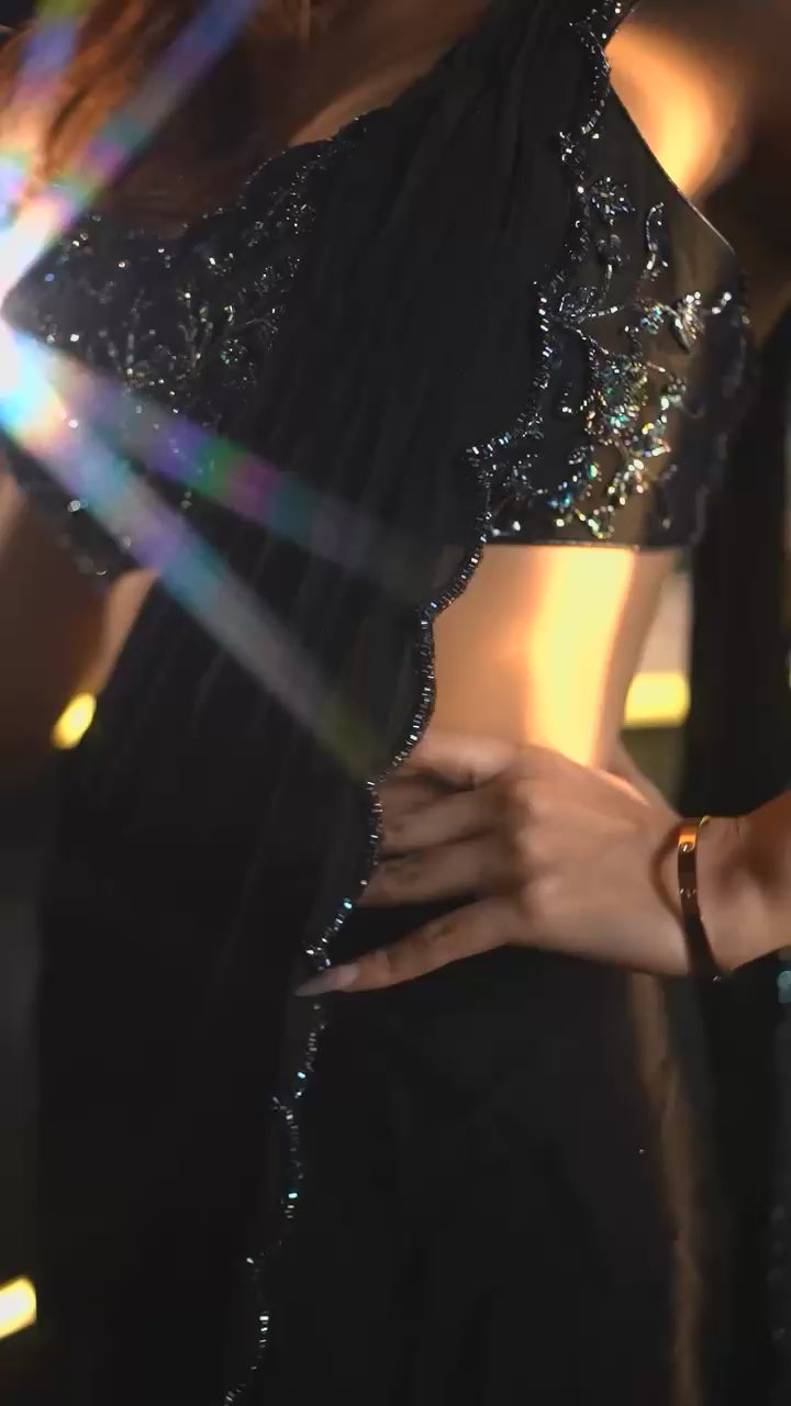 Crafted in timeless black georgette, this pre-stitched saree is elevated with intricate hand embroidery and shimmering rainbow cutdana embellishments that catch the light with every movement. Scalloped detailing along the edges adds a refined finish, while a subtle slit introduces a modern twist to the traditional drape. Designed for effortless elegance, this ensemble blends classic craftsmanship with contemporary flair.